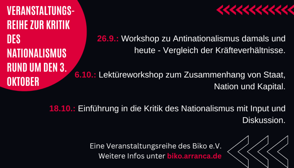 Anders als 2004 Jahren werden Proteste zu den Einheitsfeierlichkeiten 2022 in Erfurt weitgehend ausbleiben, es wird dieses Jahr nicht gelingen, eine radikale und antinationale Position in Erfurt hörbar oder gar interventionsfähig zu machen. Man kann dieses Scheitern auf Überarbeitung, Corona oder die allgemein schlechte Lage emanzipatorischer Kräfte zurückführen und liegt damit sicherlich nicht falsch. Daneben lässt sich aber nicht leugnen, dass das nationale Projekt Deutschland im Jahr 2022 wesentlich erfolgreicher darin ist, auch oppositionelle Kräfte und vormals marginalisierte soziale Gruppen einzubinden — was sich schon daran zeigt, wer 2004 ein Straßenfest //gegen// die Einheitsfeierlichkeiten veranstaltet hat und heute beim offiziellen Einheitsspektakel mitwirkt. Continue reading